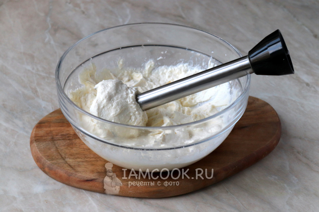 С помощью погружного блендера взбить всё до однородной массы. Учитывая, что творог у всех разный, сметану нужно добавлять небольшими порциями, тем самым контролируя консистенцию крема. Он не должен получиться жидким, но и слишком густой тоже не подойдёт. Я использовала домашний творог и добавила 3 столовые ложки сметаны и 2 (с горкой) сахарной пудры. Вы же ориентируйтесь по своему вкусу.