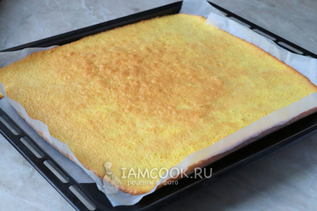 Готовый корж переложить на полотенце и снять пергамент. После чего завернуть его в рулет вместе с полотенцем. В таком положении дать ему полностью остыть.