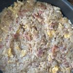 Дальше нужно приготовить обычный омлет-скрамбл. Для это взбейте крупное яйцо, вылейте его в смазанную растительным маслом сковороду и быстро жарьте на сильном огне. Яйцо нужно помешивать деревянной лопаткой, чтобы образовались кусочки.