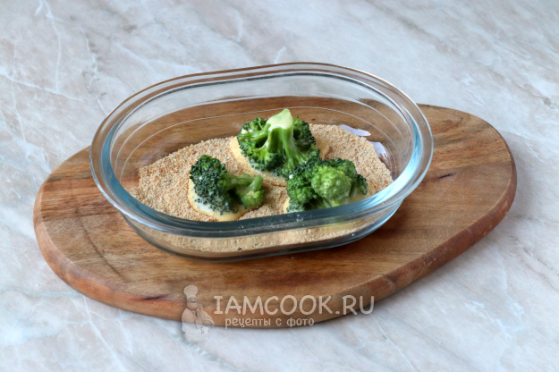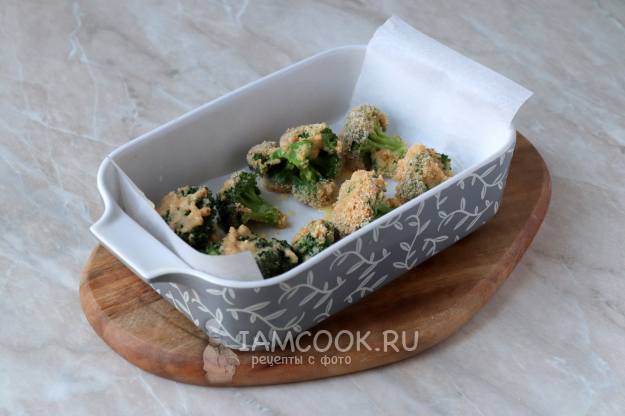 Затем обвалять в панировочных сухарях и выложить в жаропрочную форму, застеленную пергаментом.