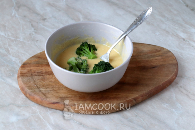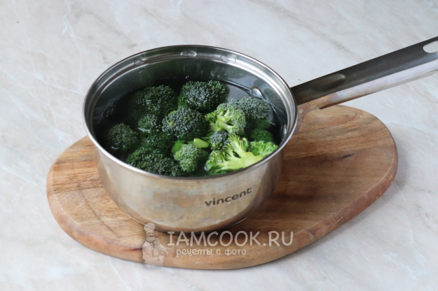 Капусту помыть и разобрать на соцветия. Затем проварить 2 минуты в подсоленной воде. После чего брокколи откинуть на дуршлаг, чтобы стекла лишняя жидкость.
