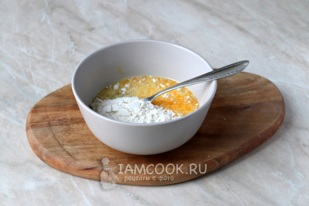 Затем ввести просеянную пшеничную муку и снова перемешать. Учитывая, что мука у всех разная, её может понадобиться немного больше или меньше, чем указано в ингредиентах. Поэтому добавлять её нужно по 1 столовой ложке, каждый раз хорошо перемешивая.
