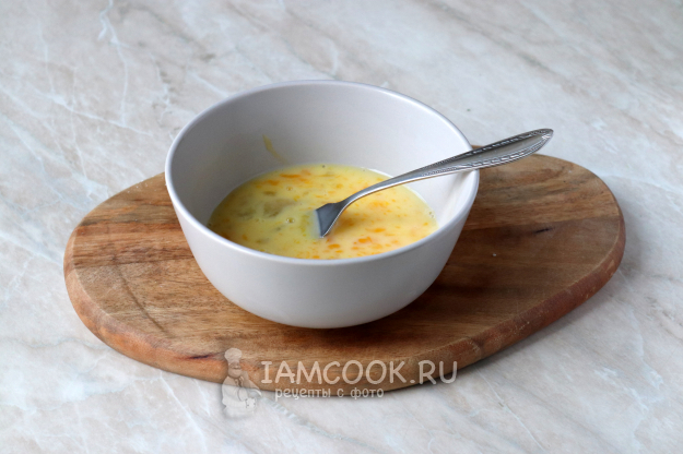 В глубокую миску вбить куриное яйцо, добавить щепотку соли и молоко. Тщательно перемешать до однородной массы.