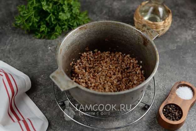 Первым делом нужно отварить гречку. Крупу промойте, залейте чистой водой в пропорции 1 к 2, варите на умеренном огне минут 15-17, вода должна выкипеть, а гречка - стать полностью готовой. Разрыхлите кашу вилкой или ложкой и остудите.