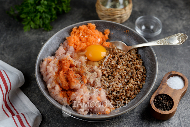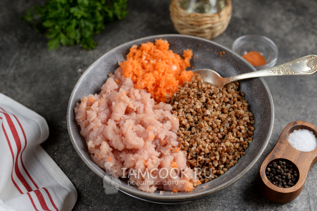В удобную глубокую миску переложите овощи, фарш из индейки и остывшую гречневую кашу.