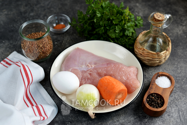 Возьмите все продукты для котлет из индейки с гречкой. Филе зачистите от пленки, жир тоже можно срезать. Лук и морковь почистите, помойте вместе с индейкой.