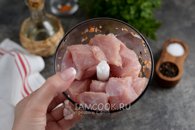Индейку нарежьте кусками, переложите в блендер, смелите в фарш.