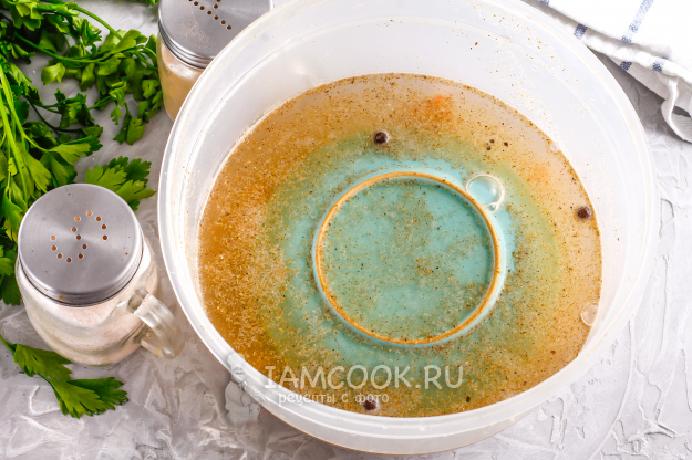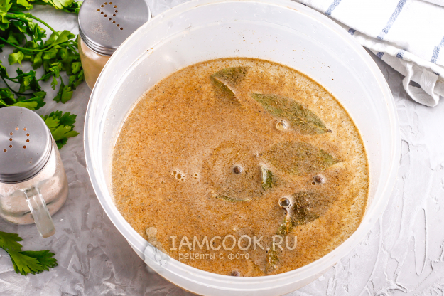 Накройте рыбу в рассоле блюдцем и поместите любой гнет: банку с водой, гирю и т.д. Вынесите емкость на холод или поместите в холодильник на 2-4 дня. Каждый день перемешивайте содержимое емкости для равномерной засолки.