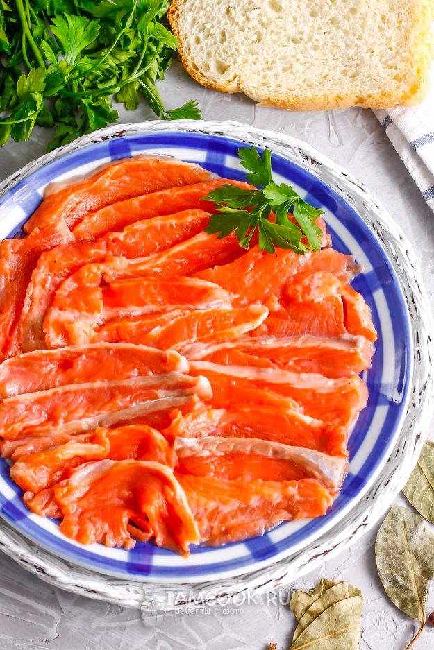 Спустя указанное время нарежьте мякоть горбуши пряного посола ломтиками и выложите на тарелку. Подайте к столу вместе с хлебом, поджаренными тостами и другой несладкой выпечкой.
