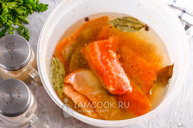 Промойте кусочки рыбы и выложите их в тузлук. Можно засолить горбушу с чешуей, но я предпочитаю счищать кожу с рыбы, чтобы потом не заниматься этим с готовым продуктом.
