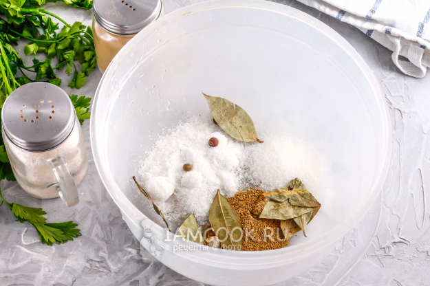 В глубокую емкость всыпьте все указанные специи, пряности, соль и сахар. Я использую пластиковую емкость для пищевых продуктов, но вы можете засолить рыбу в банке или контейнере.