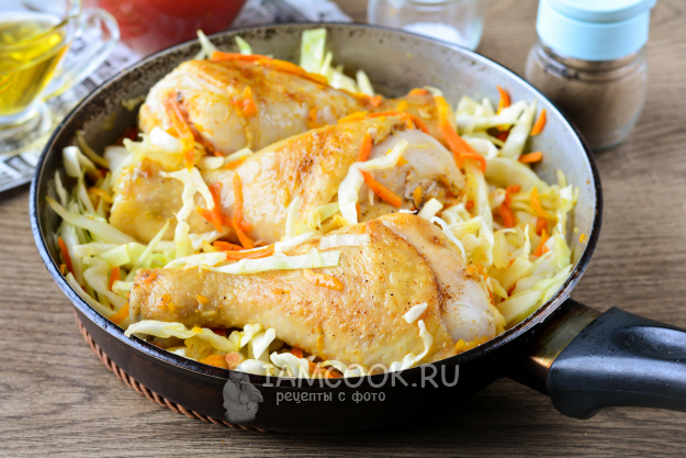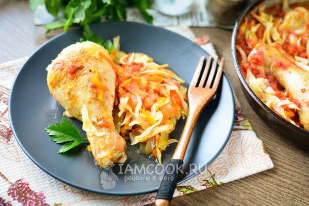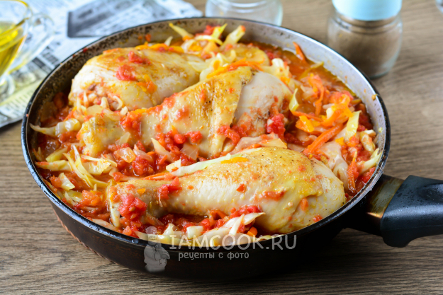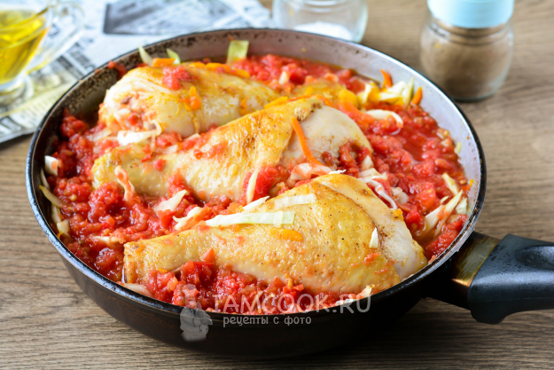 Влейте томатный сок, при необходимости долейте немного воды. Посолите и тушите курицу с капустой на сковороде под крышкой на небольшом огне 30-35 минут.