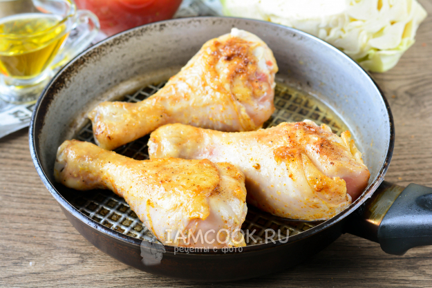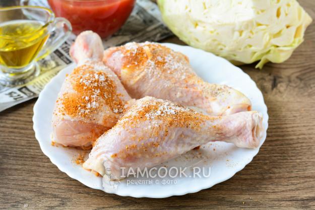 Промойте куриное мясо, удалите перья, почистите от лишних пленок. Голени натрите солью, черным молотым перцем и приправой для курицы.