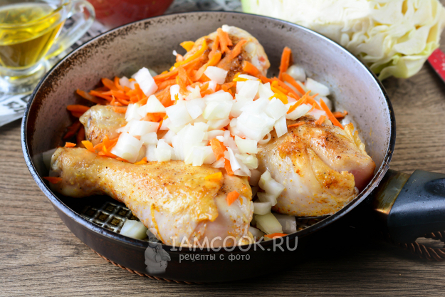 Пока жарится курица, нарежьте кубиками репчатый лук, а морковку натрите на терке. Именно лук с морковкой отлично дополняют и сочетаются с капустой.