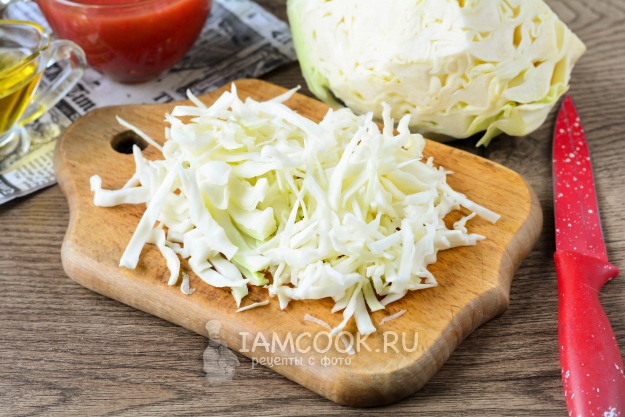 Нашинкуйте капусту удлиненными полосками.