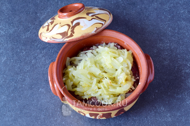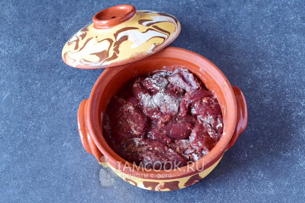 Выкладываем печень в порционные глиняные огнеупорные горшки, желательно, чтобы они были с крышками.