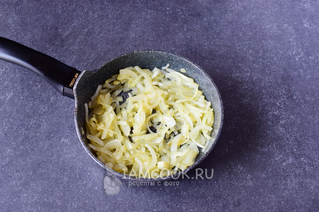 В сковороде разогреваем растительное масло и обжариваем лук 3-4 минуты. Не оставляйте лук без присмотра, перемешивайте его, чтобы он не подрумянился. Нам нужно, чтобы лук стал прозрачным и слегка мягким.