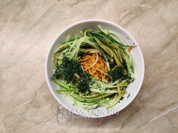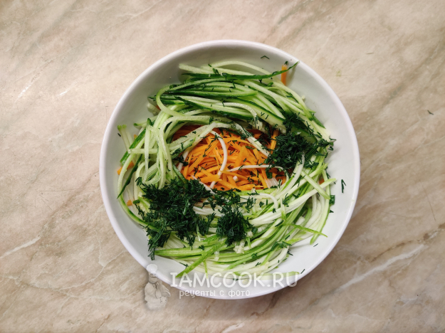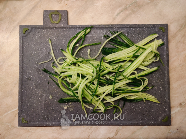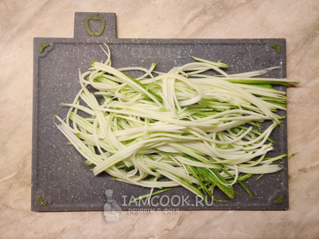 Точно так же нашинкуйте кабачок. Овощи можно потереть на специальной терке для моркови по-корейски, а можно использовать и специальный фигурный нож.