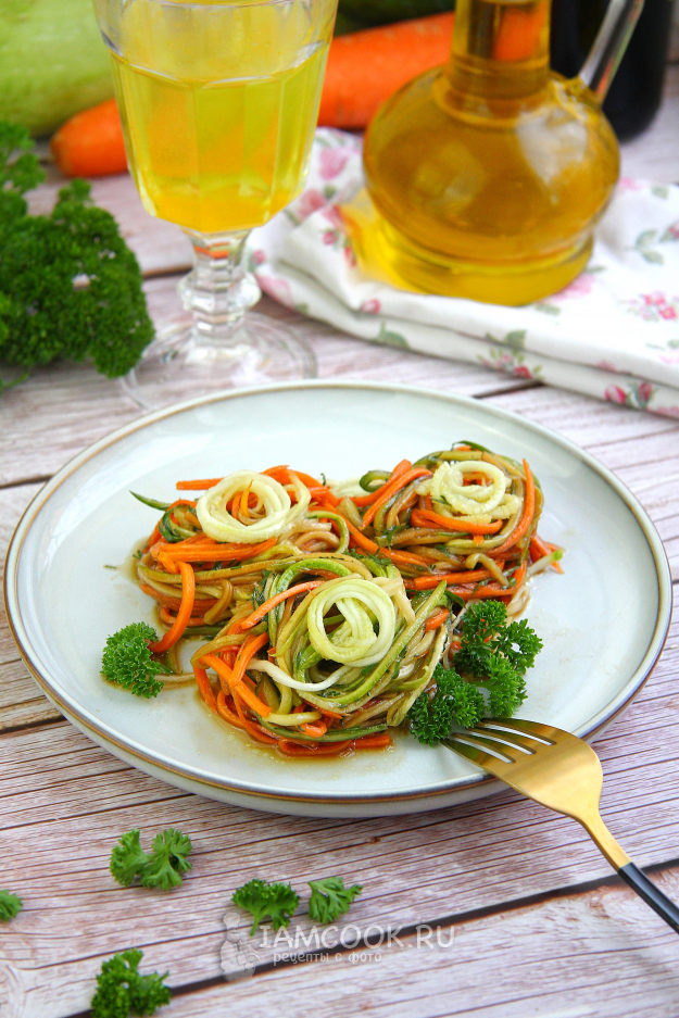 Накрутите овощи на вилку так, если бы это были спагетти, и выложите получившиеся «гнездышки» на тарелку для подачи. Приятного аппетита!