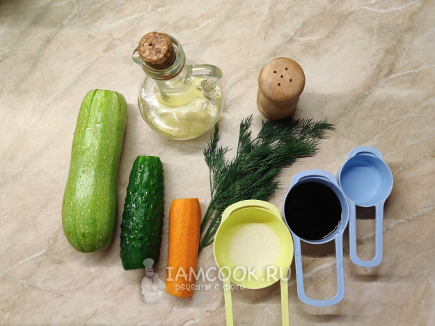 Для начала подготовьте все необходимые ингредиенты для овощного салата из кабачков с огурцами и морковью. Овощи и зелень вымойте. Морковь очистите.