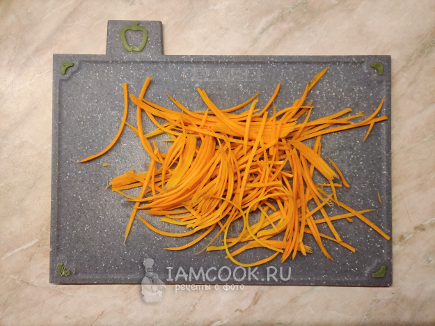 Морковь натрите или измельчите длинной тонкой соломкой.
