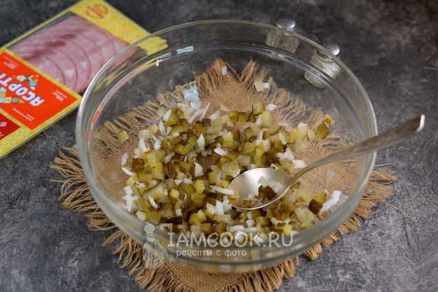 Первым делом нарежьте квашеные огурцы и репчатый лук, смешайте их. Пока будете нарезать остальные овощи - лук замаринуется.
