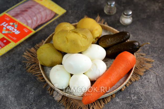 Подготовьте все продукты для салата «Оливье» на Новый год быка. Картофель и морковь помойте под проточной водой жесткой кухонной губкой. Сложите овощи и куриные яйца в казан, варите все до готовности. Яйца обычно готовы за 10 минут, моркови нужно около 15, а на картофель может уйти и 20 минут. Проверяйте готовность ножом с острым лезвием.
