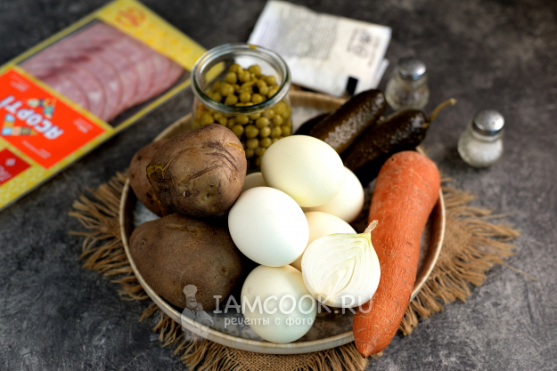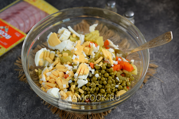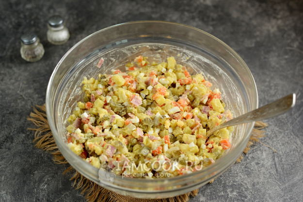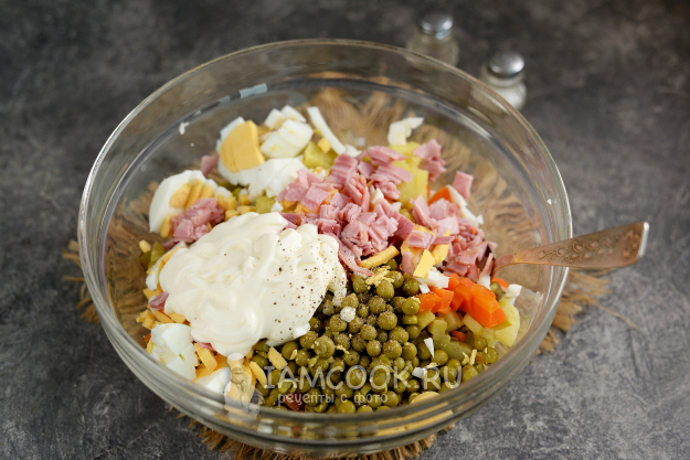 Так же измельчите большую половину ветчины, посолите и поперчите по вкусу, заправьте майонезом любимого производителя.