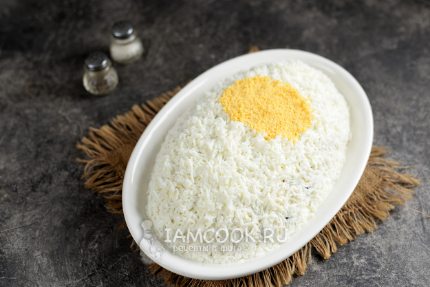 Оставшиеся три яйца разделите на белки и желтки, натрите их на самой мелкой терке. До последнего момента я не знала, как будет выглядеть мой бычок. Сначала я выложила мордаху, но этот внешний вид показался мне слишком скучным.