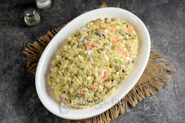 Возьмите любое подходящее для салата блюдо, желательно овальной формы. выложите Оливье, придав ему овальную форму.