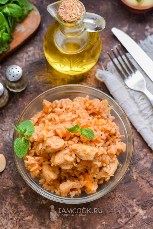 Влить в сковороду теплую воду, огонь убрать на минимум, готовить рис под крышкой 25 минут. После приготовления подавать рис с тыквой и курицей к столу.