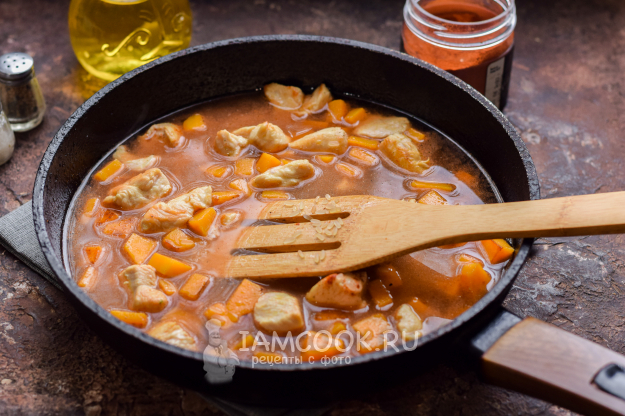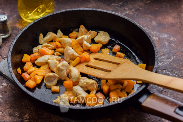 Прогреть хорошо сковороду, слегка смазать растительным маслом, выложить тыкву и курицу - жарить, помешивая, 7-10 минут на небольшом огне.