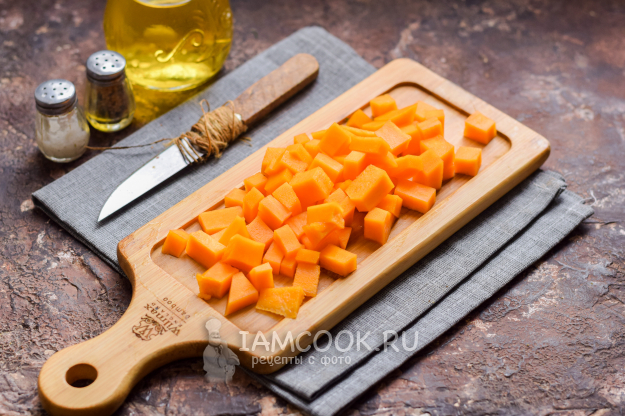 Аккуратно очистить тыкву, удалить семена и волокна. Нарезать тыкву небольшими по размеру кубиками.