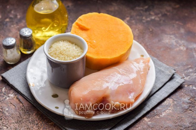 Для приготовления риса с тыквой и курицей на сковороде понадобятся следующие продукты.