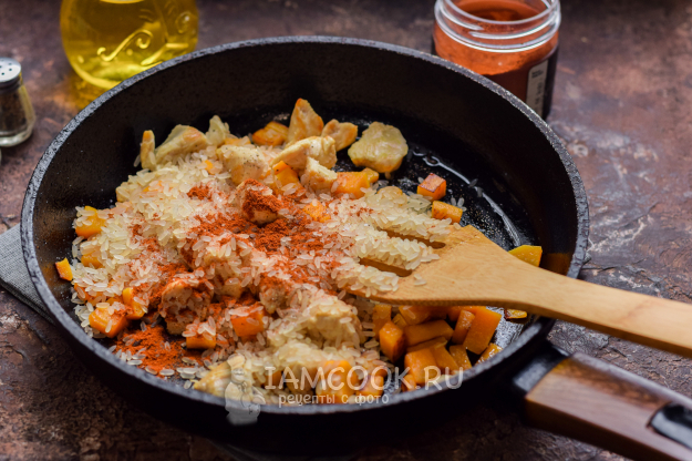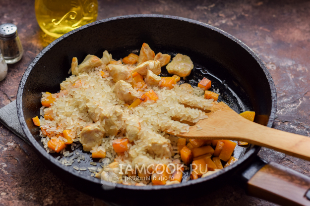 Добавить в сковороду порцию риса.
