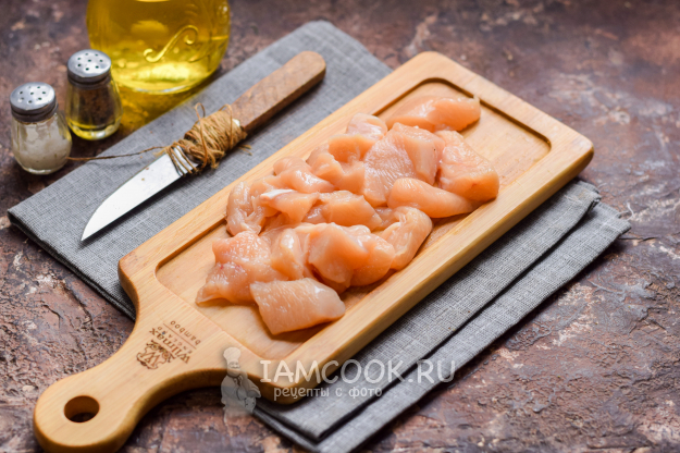 Куриное филе ополоснуть и просушить, после нарезать филе небольшими кусочками.
