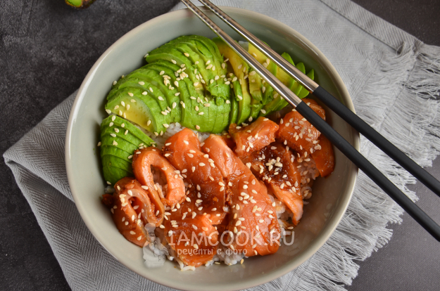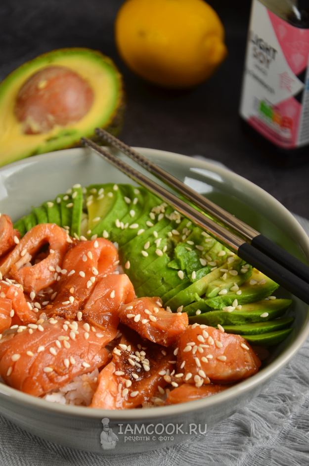 Перед самой подачей поке с лососем и авокадо на стол сбрызните авокадо и рыбу лимонным соком, добавьте кунжут.