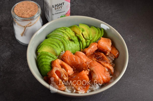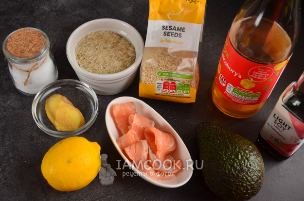 Возьмите всё необходимое для приготовления поке с лососем и авокадо. Сразу же поставьте вариться рис в подсоленной воде. В рецепте используется басмати, но подойдет любой, который есть в наличии.