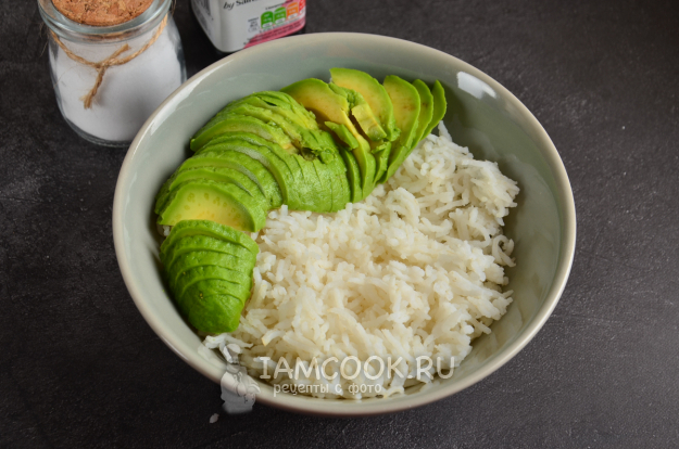 Авокадо почистите и удалите косточку. Половинку нарежьте тонкими ломтиками и выложите сверху на рис.