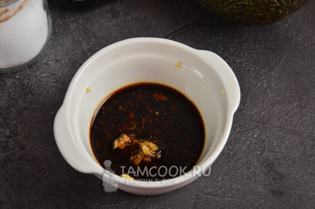 Пока варится рис, можно приготовить маринад для рыбы. В пиалу налейте соевый соус, яблочный уксус, добавьте тертый корень имбиря. Все перемешайте.