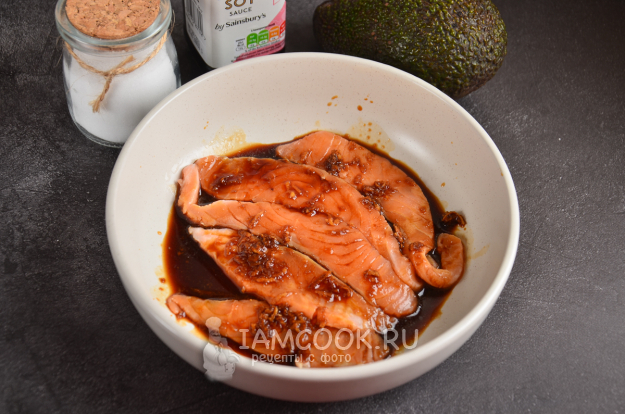 В тарелку переложите ломтики рыбы и залейте маринадом. Оставьте в холодильнике на четверть часа.