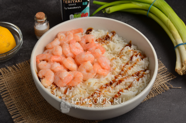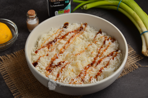 Сваренный рис переложите в пиалу, полейте соусом терияки (2 ст.л).