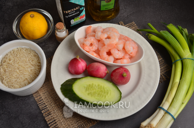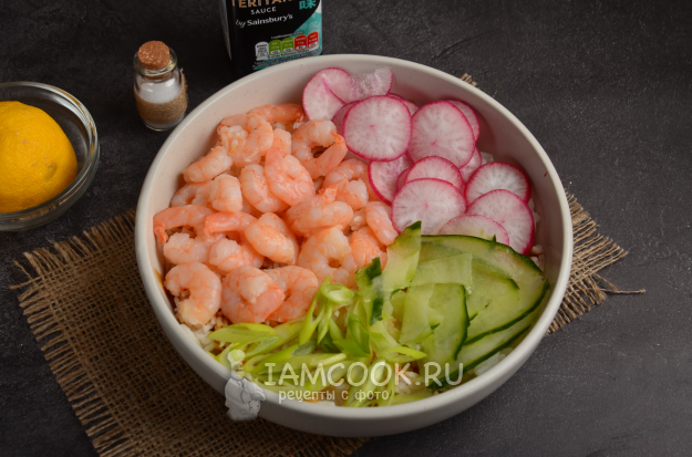 Подготовьте все нужные продукты для поке с креветками. Если креветки были заморожены, разморозьте их при комнатной температуре. Если есть панцири, их нужно снять, затем удалить кишечную вену. Сразу же поставьте вариться рис в подсоленной воде.