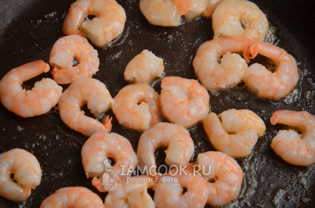 Раскалите любое растительное масло на сковороде, выложите очищенных креветок и поджарьте на тихом огне в течение двух минут, помешивая.