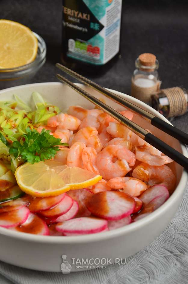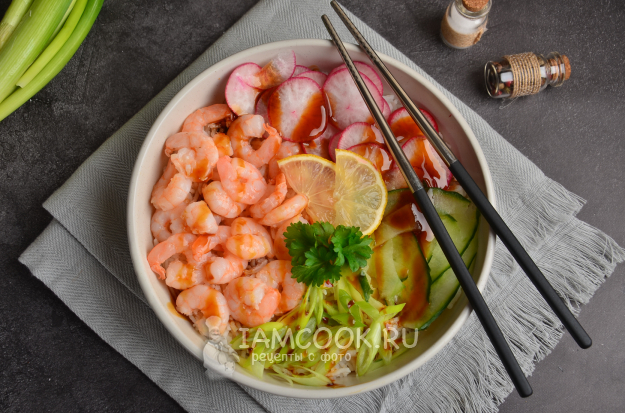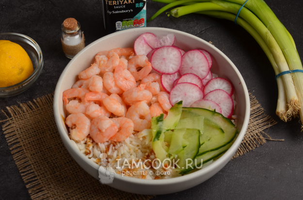 Перед подачей дополнительно полейте поке с креветками соусом терияки, добавьте зелень по вкусу, ломтики лимона.