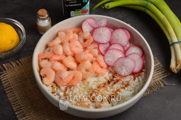 Редис помойте и обрежьте хвостики, нарежьте тонкими пластинками и выложите их рядом с креветками.
