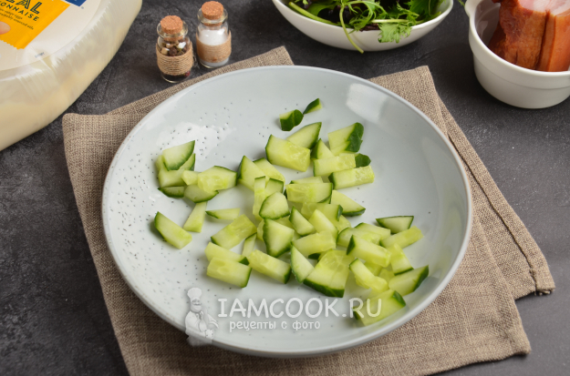 В салатник отправьте нарезанный небольшими кусочками свежий огурец. Если кожура жесткая - можно ее срезать.