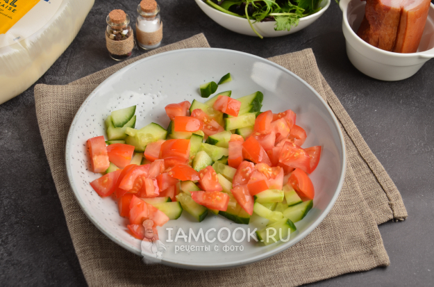Помидоры нарежьте небольшими кусочками и отправьте в салатник.