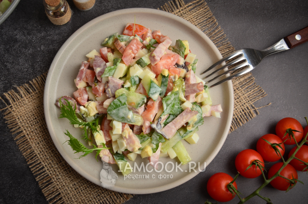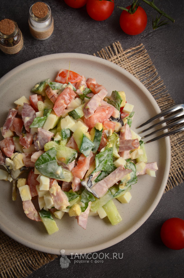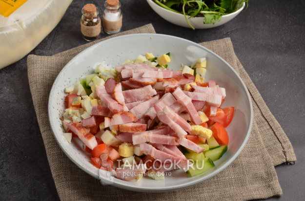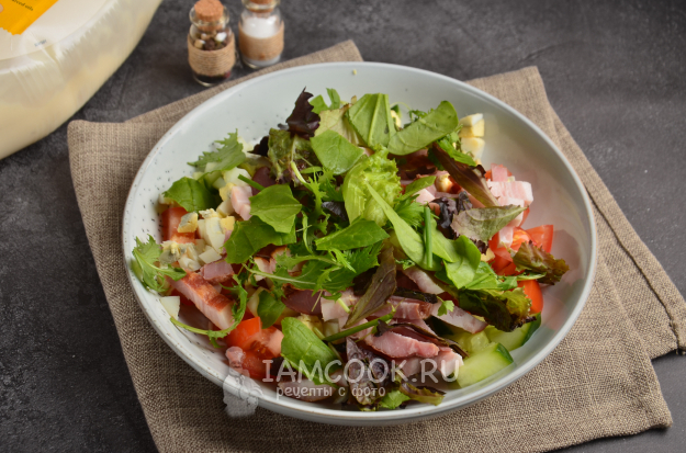 К столу салат с копченой свиной грудинкой, овощами и вареными яйцами подавайте сразу после заправки, так как он может стать водянистым.