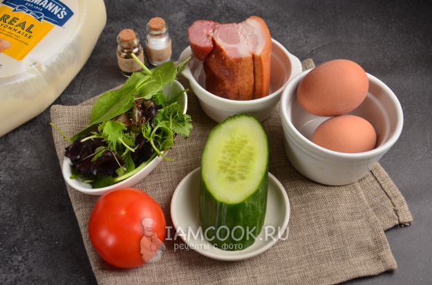 Подготовьте все необходимые продукты для салата с копченой свиной грудинкой, яйцами и овощами. Куриные яйца заранее сварите вкрутую и остудите. Помойте свежие овощи и зелень.